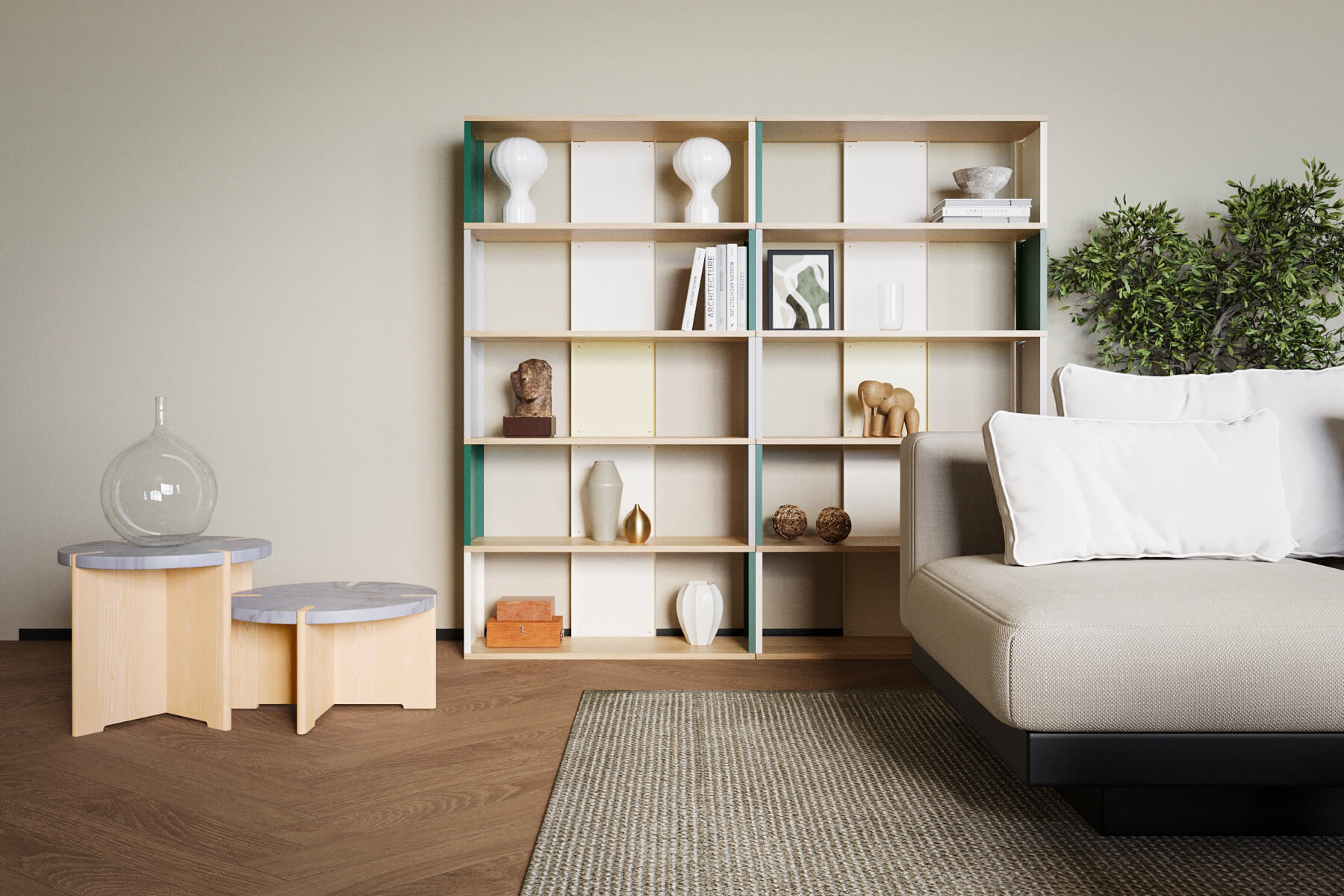Modulares Regalsystem aus Eiche & farbigem Stahl – Christoph Steiger Möbeldesign.